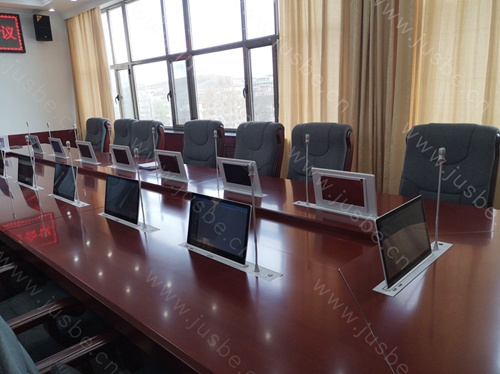 該項目會議桌安裝的內嵌式桌面雙顯帶話筒升降一體終端,屏幕界面美觀、簡明,操作方便,全程只需觸控屏幕即可完成會議內容的各項操作,極大提高了會議效率。整套無紙化會議系統功能豐富,可提供會議電子簽到、會議議程、資料上傳下載、表決投票、資料共享、文檔同步閱讀、同屏投影、批注、文檔加密、電子白板交流、網頁瀏覽、視頻播放等多種會議服務功能。通過這種全程無紙就能貫通會議環節的會議方式,為組織會議人員和參會人員提供了一個極其實用、高效的無紙化會議平臺。