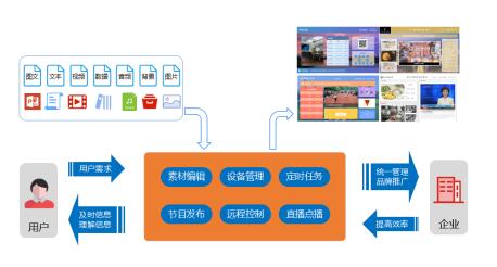 目前,仍有大部分企業(yè)宣傳基于展架、海報等方式,內(nèi)容單一,手動置換耗時耗力,存在著時效性差、不環(huán)保等一系列問題,品牌形象得不到推廣;而通用的信息發(fā)布則多以零散分布的電子顯示為主,終端設(shè)備管理和維護難度大,產(chǎn)品使用壽命較短。