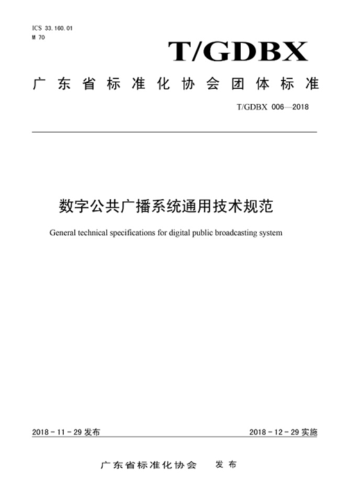 2018年12月itc主編的《數(shù)字公共廣播系統(tǒng)通用技術(shù)規(guī)范》率先通過了廣東省標(biāo)準(zhǔn)行業(yè)協(xié)會的專家評審,并于2018年12月29日實施。