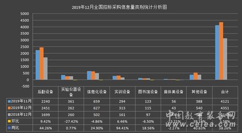 2019年12月份,根據中國教育裝備網對國內教育裝備招中標采購信息量的數據統計顯示,該月招標采購信息量為4351條,較上月有小幅增長,較去年同期有明顯增長。
