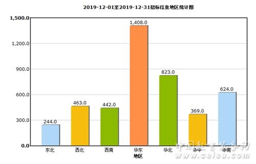 從12月招標采購信息地區統計圖(如圖3所示)和全國招標采購信息量地區占比圖(如圖4所示)可以看出:華東地區招標采購信息量為1408條,占比32%;華北地區招標采購信息量為823條,占比19%;華南地區招標信息采購量為624條,占比14%;西北地區招標采購信息量為463條,占比11%;西南地區招標采購信息量為442條,占比10%;華中地區招標采購信息量為369條,占比8%;東北地區招標采購信息量為244條,占比6%。