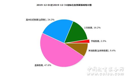 12月份招標采購信息所屬領域統計情況如圖6所示:學前教育占比為2.5%;義務教育占比為16.2%;高中階段教育(含職教)占比為24.3%;高等教育占比為47.6%;其他教育(含特殊教育)占比為9.4%。