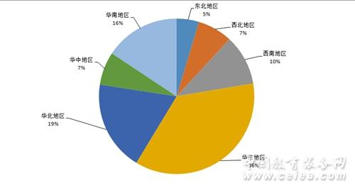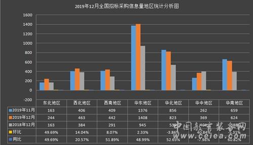 綜合12月全國招標采購信息量地區統計分析圖(如圖5所示):華東地區環比增長2.33%,同比增長48.99%;華南地區環比下降5.31%,同比增長60.82%;華北地區環比下降3.86%,同比增長52.69%;華中地區環比增長40.84%,同比下降7.98%;西北地區環比增長14.04%,同比增長20.57%;東北地區環比增長49.69%,同比增長49.69%;西南地區環比增長8.07%,同比增長51.89%。