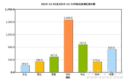 從12月中標信息地區統計圖(如圖8所示)和全國中標信息地區占比圖(如圖9所示)來看:華東地區中標信息量為1448條,占比36%;華北地區中標信息量為747條,占比19%;華南地區中標信息量為625條,占比16%;西南地區招中標信息量為417條,占比10%;西北地區中標信息量為288條,占比7%;華中地區中標信息量為275條,占比7%;東北地區中標信息量為185條,占比5%。