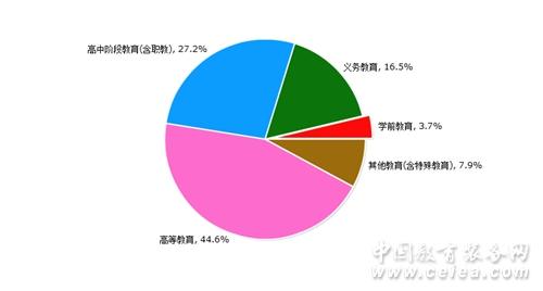 12月中標信息所屬領域統計圖,如圖10所示:學前教育占比為3.7%;義務教育占比為16.5%;高中階段教育(含職教)占比為27.2%;高等教育占比為44.6%;其他教育(含特殊教育)占比為7.9%。