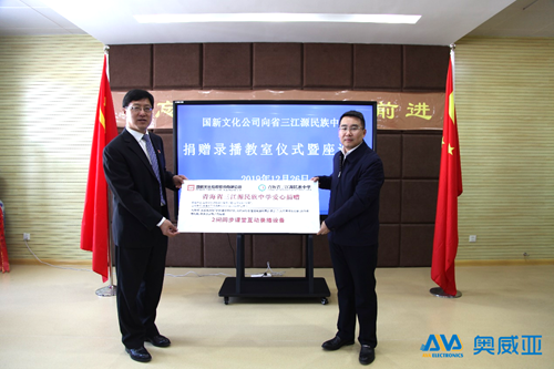 圖為:奧威亞母公司國新文化向青海省三江源民族中學捐贈同步課堂互動錄播設備的場景