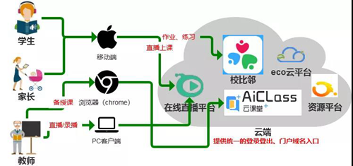 疫情期間的天聞數(shù)媒在線智慧教學(xué)解決方案基于ECO云開放平臺,整合Ai課堂、Ai作業(yè)、在線直播、校比鄰四大核心產(chǎn)品,聚集ECR教育資源云平臺中精準(zhǔn)、豐富、優(yōu)質(zhì)的數(shù)字化內(nèi)容,完整覆蓋課前、課中、課后、課外的教與學(xué)全流程,通過統(tǒng)一的訪問入口,為學(xué)校、教師、學(xué)生、家長提供無處不在的互動教學(xué)及資源共享服務(wù),真正實(shí)現(xiàn)疫情期間“離校不離教,停課不停學(xué)”。