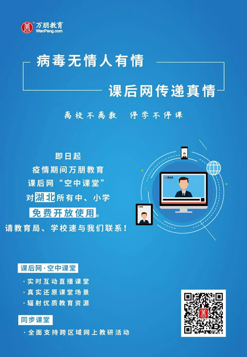 即日起,面向湖北省各中小學,萬朋教育課后網空中課堂疫情期間一律免費使用!力保疫情期湖北地區中、小學教學進度不受影響,教研不間斷!