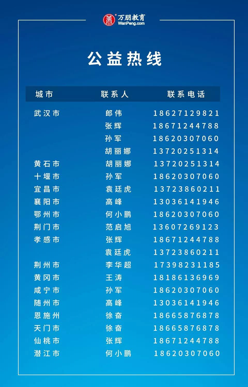 何小鵬電話改為18871179965 。也可直接在公眾號后臺留言,我們將以最快速度和您取得聯系。留言方式:城市-學校/教育局-聯系人-手機號有任何相關問題,可咨詢400-863-2003專線。疫情防控期間萬朋教育課后網·空中課堂、同步課堂、技術研發、課后服務等團隊將提供全方位支持,讓所有課堂準時、高效進行,教學進度不受影響,教師教研不受限制。