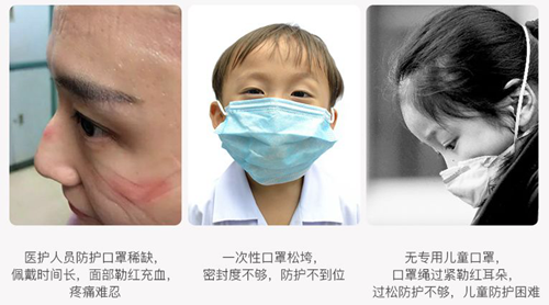 沖鋒在一線的醫務工作者、警務人員、志愿者等在與時間賽跑、疫情抗爭同時,他們需要長時間佩戴口罩。由于鼻梁顴骨和耳部等部位皮膚真皮層較薄,而且每個人的腦袋大小不一,長時間佩戴口罩不僅在臉上和耳后產生了深深的勒痕,充血,甚至出現傷口。