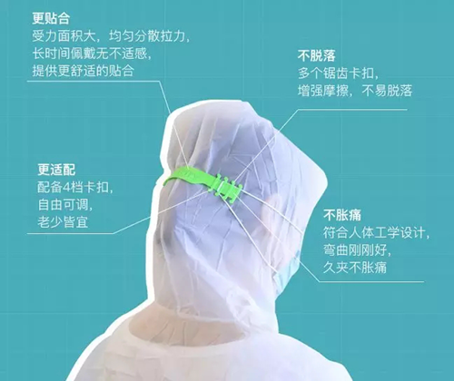 用TPU制成的口罩扣既能保證口罩佩戴過程中的強度要求,又能柔軟地貼合頭部表面,不產生勒痕,安全環保,對人體沒有毒副作用。由于是熱塑性塑料,支持除高溫高壓以外的所有消毒方式,消毒之后可以再利用。