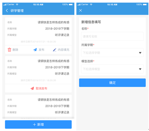 研學管理模塊主要管理個人研學計劃,通過此功能模塊教師可以記錄和發布教學個人計劃、集體研修、聽評課記錄、參培記錄、課列研磨等信息。參加教研活動的老師,可以對主持人或上課人進行評價,評價時可以輸入文字內容也可以拍照。評價過后主持人或上課人可以查看所有關于活動的評價內容。