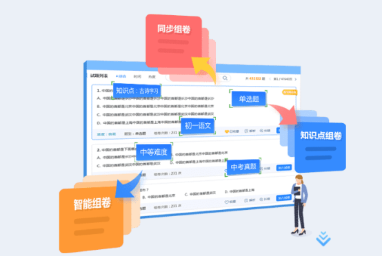在線組卷考試,試題庫是否足量適當很關鍵。AI測評的題庫中心包含各學段、多學科、多版本的試題資源,老師可以從章節、知識點、題型、難度等多維度進行查詢。“支持知識點組卷、同步組卷、智能組卷三種組卷模式,老師可根據需求來選擇。”付華林說。