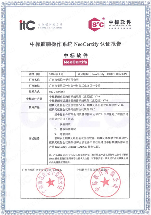 近日,中標軟件有限公司質量保障中心與廣州市保倫電子有限公司完成雙方產品的兼容性測試工作,itc麒麟無紙化主機、終端軟件成功通過了中標軟件NeoCertify CERTIFICATION 級別認證,表明該款產品已經能夠達到中標麒麟Linux操作系統通用兼容性要求及性能、可靠性要求,該認證產品能夠滿足用戶的關鍵性應用需求。