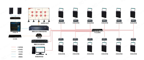 系統由后臺管理服務主機、采集投屏主機、升降屏幕、無紙化終端、數字會議系統等組合而成,適用于的各種政企單位會議場景。