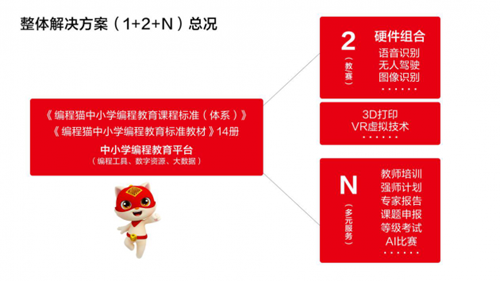 編程貓“1+2+N”整體解決方案,是國(guó)內(nèi)首個(gè)以自主研發(fā)工具、課程平臺(tái)、教師管理系統(tǒng)及激勵(lì)工具為基礎(chǔ),以完善的編程教育教材與課程體系為支撐,以編程學(xué)科課程為核心的人工智能教學(xué)方案,未來(lái)還將集無(wú)人駕駛、語(yǔ)音識(shí)別、VR/AR技術(shù)、3D打印、機(jī)器人等前沿科技教育為一體,形成完善、全面、可持續(xù)、可擴(kuò)展的整體教育解決方案。