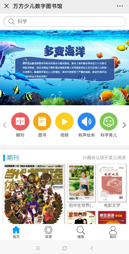 資源包括:優(yōu)質(zhì)的科普視頻資源、精美的有聲繪本、各類豐富的期刊文獻(xiàn)、圖書(shū)、視頻。暢游知識(shí)海洋,定會(huì)收獲多多!