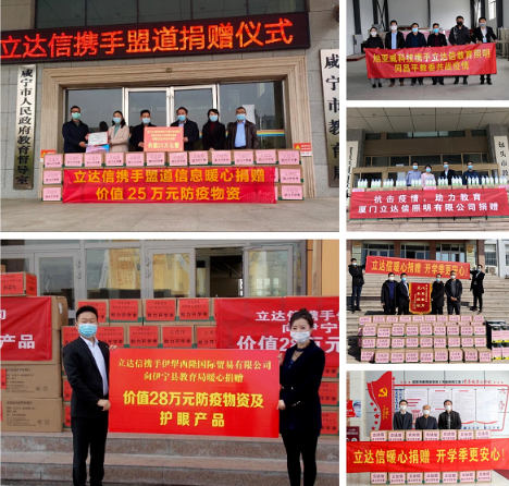 2020年3月,立達(dá)信作為教育照明領(lǐng)域的開(kāi)創(chuàng)者和領(lǐng)跑者,一直心系教育,關(guān)注學(xué)校防疫需求,分批次采購(gòu)價(jià)值600萬(wàn)防疫物資,并陸續(xù)捐贈(zèng)給全國(guó)各地學(xué)校,助力開(kāi)學(xué)季!