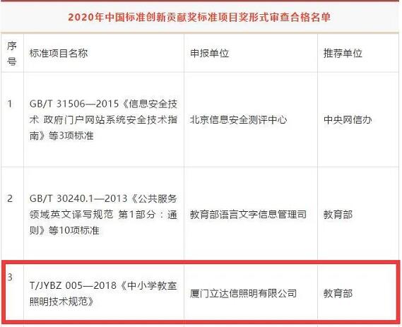 《中小學(xué)教室照明技術(shù)規(guī)范》標(biāo)準(zhǔn)歸口單位為中國教育裝備行業(yè)協(xié)會,由立達信提出并牽頭起草。標(biāo)準(zhǔn)自2018年5月1號實施以來,取得了良好的社會反響,獲得多項榮譽:入選工業(yè)和信息化部2019年標(biāo)準(zhǔn)應(yīng)用示范項目名單,今年更獲教育部推薦、經(jīng)國家市場監(jiān)管總局評選入選2020年中國標(biāo)準(zhǔn)創(chuàng)新貢獻獎形式審查合格名單。