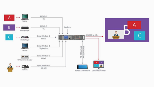 它具有超低延時,以單像素為基準,精確調節(jié),模組化設,支持4K 50/60HZ 4:4:4影像輸出。同時還具有四圖層畫面,各圖層可任意切換大小位置,額外還擁有一個靜態(tài)背景圖層,真正無縫切換和漸進漸出。