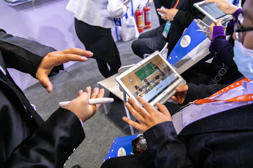 常態(tài)化智慧課堂展區(qū)的小組研討式新型研討方案引得人群紛紛聚集,參展嘉賓拿起希沃學(xué)生平板體驗(yàn),感受師生互動(dòng)課堂的高效與便利。