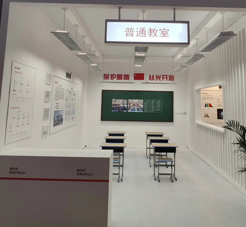 普通教室展示區,采用的是拓享自主研創的“LED健康黑板燈+LED健康教室燈+LED智能教室燈”方案。燈具均采用進口防眩光膜,擁有極佳的防眩效果,側面完全感受不到燈具發光,唯有燈下才能感受到,可以長時間直視光源而不傷眼。
