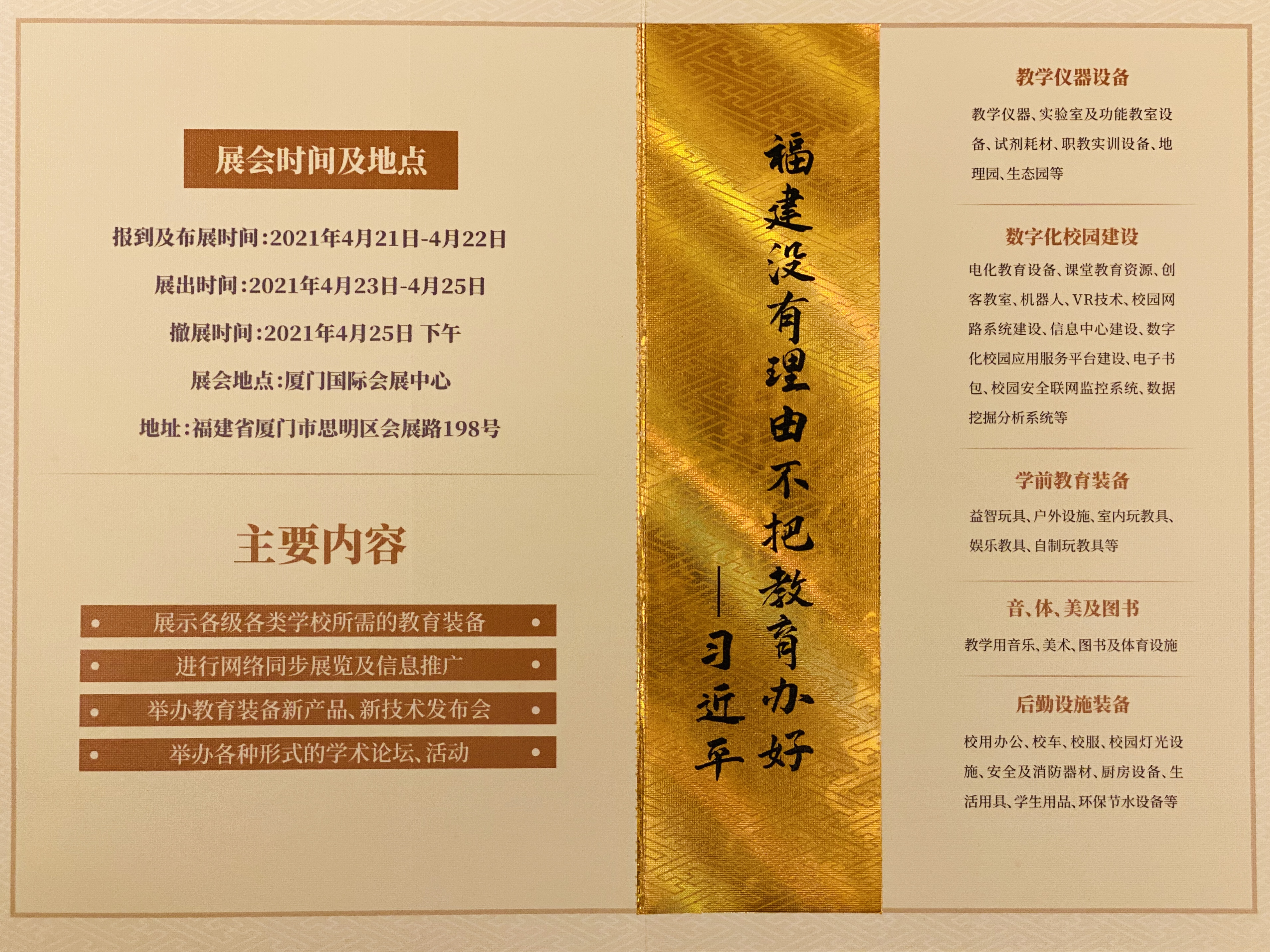 中國教育裝備展示會自1980年舉辦至今,已成功舉辦78屆。作為全國性教育裝備專業展會,以整合營銷、調節供需、技術推廣、產業聯動、產學研結合等為功能,已發展成為中國乃至全球教育裝備行業規模最大、影響最廣、專業性最強的品牌展會。憑借在展會行業取得的突出業績,以及良好的帶動效應、廣泛的行業影響、鮮明的專業特色等顯著優勢,已連續六次被評為全國行業品牌展會金手指獎,被列入商務部國家重點引導、支持展會。