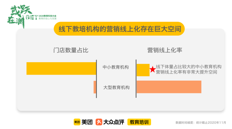 再來看目前中國教育行業的營銷線上化的水平,一個非常客觀的事實表明,真的會線上招生的機構只有9%,而越是新的行業,線上營銷的水平相對就越大。例如,在疫情中,最火的一個教育行業自習室,它的線上營銷的比例接近100%。但在線下已經存在20年以上的教育行業,例如駕駛培訓、學歷提升、學科輔導、留學等,可能還是更習慣于通過易業合作、發傳單,會議等線下手段獲取生源。