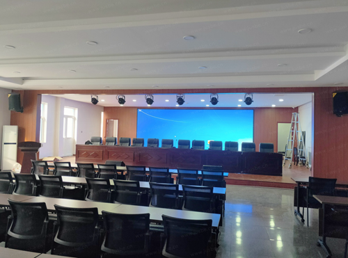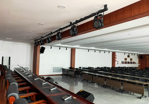 主席臺上方,布置了一排頂排光,面光布置范圍以領導座位范圍計算吊裝,實現整個主席臺擁有均勻照明。此套燈光具有靈活多變的RGBW混色調節,HSL混色調節、多種頻閃效果和顏色彩虹功能,即使用來舉辦小型演出活動也能達到渲染舞臺氛圍的效果。