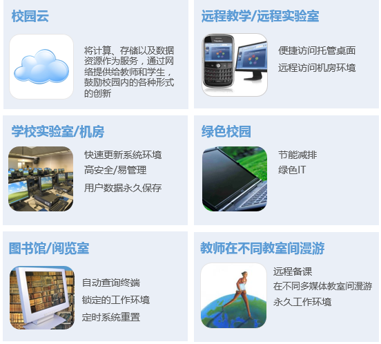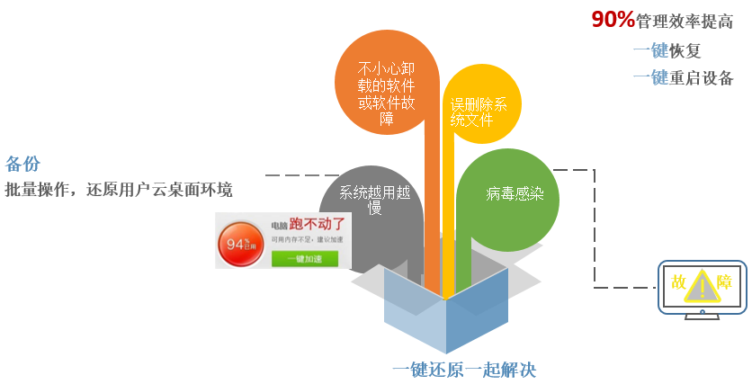 集中部署防病毒軟件、安全補丁,虛擬化隔離、云端病毒查殺,鏡像處理機制可有效拒絕不良彈窗。