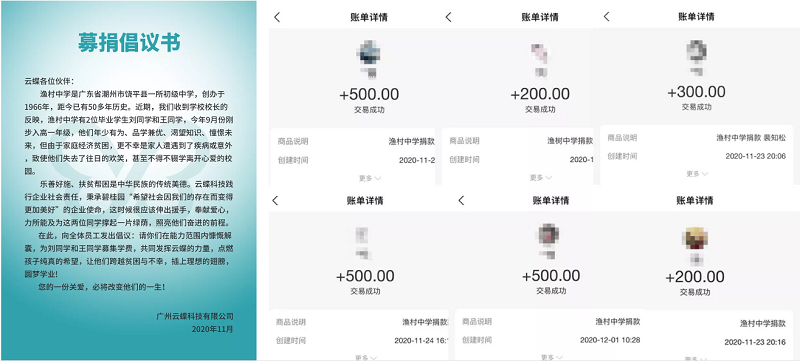 在得知這一情況后,云蝶主動承諾每年向兩位學(xué)生捐助學(xué)費,以幫助他們順利完成學(xué)業(yè)。云蝶科技的同事們也紛紛伸出援手,在公司內(nèi)部發(fā)起捐款行動,踴躍奉獻愛心。