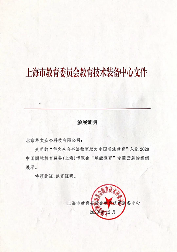 披荊斬浪,勇往直前。2020年,對華文眾合來說是收獲滿滿的一年,繼與教育部教育裝備研究與發展中心聯合成立“中小學智慧書法教育研究中心”,首次專家研討會成功舉辦后,作為國內智慧書法教育領域的領軍品牌,華文眾合參選2020中國國際教育裝備(上海)展覽會“賦能教育”專題云展的《華文眾合智慧書法教室助力中國書法教育》教育案例視頻作品,獲評為“技術賦能”優秀作品,華文眾合獲得行業和社會認可的同時,以領先的教育實力鑄就深遠的書法教育影響。