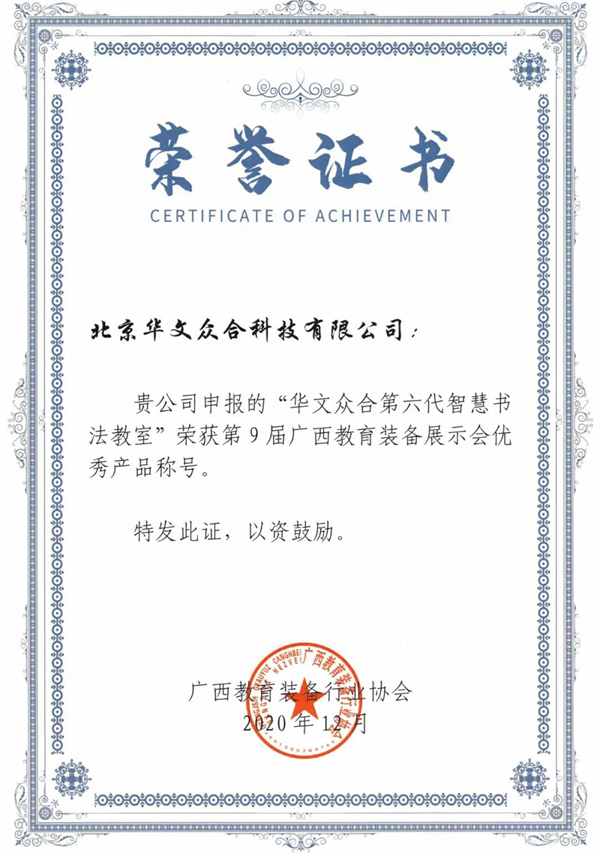 “華文眾合智慧書法教室”被評為中國教育裝備行業協會2020年度推薦產品