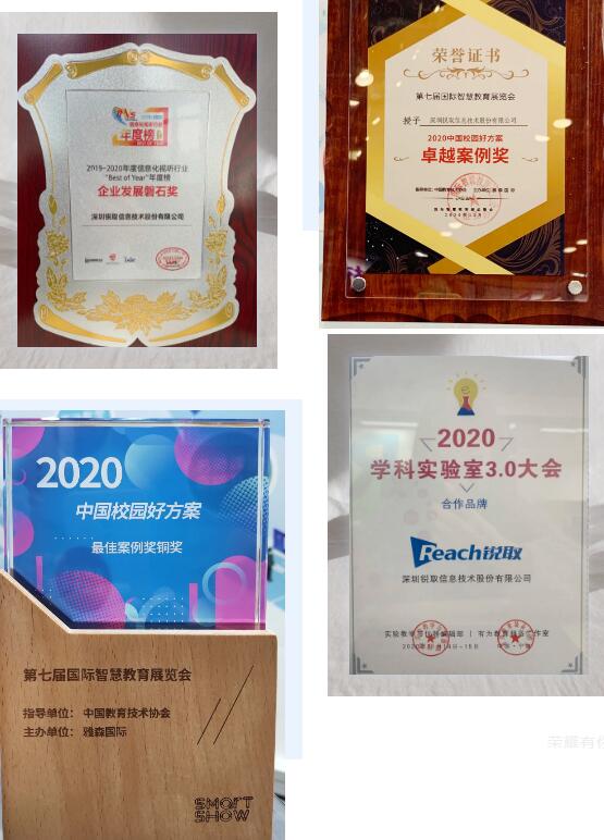 榮譽閃耀,熠熠生輝。這一年,銳取以強大的品牌實力和技術成果滿載勝利,高質量產品及優良服務獲得眾多客戶及合作伙伴的認可與贊譽。在第七屆國際智慧教育展覽會的校園好方案評選上,銳取憑借““教考融合·三個課堂”方案在數千份參賽方案中脫穎而出,成功斬獲“最佳案例獎”和“卓越案例獎”!在一年一屆的信息化視聽行業年度榜“Best of the Year”中,銳取以強大實力與行業口碑榮獲“企業發展磐石獎”;在2020學科實驗室大會3.0上,銳取作為大會合作伙伴閃耀亮相大會現場。2020年,銳取在鼓勵與肯定中砥礪前行,創造精彩!
