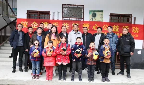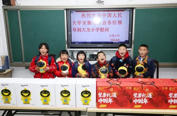 中午,安慶市太湖縣城西鄉大龍村大龍小學,全部六名山村留守兒童高興地收到了新年大禮包——每人500元壓歲錢、年貨和云教育學習機器人、書包文具等,這是中國人民大學商學院安徽校友會(3班)成員之一的天立泰信息公司總經理隋勝和營銷總監趙玉柱、居上酒業總經理阮壽俊、榮商物聯總經理馬國贊驅車500多里翻山越嶺專程送來的。