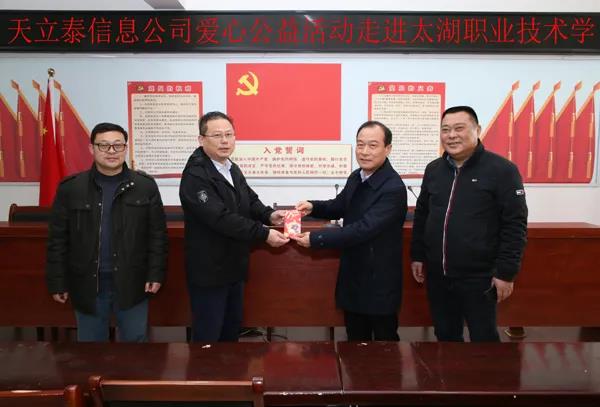2月6日上午,安徽天立泰信息公司愛心公益活動走進太湖職業技術學校,總經理隋勝(左二)、銷售總監趙玉柱(右一)把捐贈給貧困生的新年壓歲錢交由太湖職業技術學校校長張璇(右二)代為轉交。