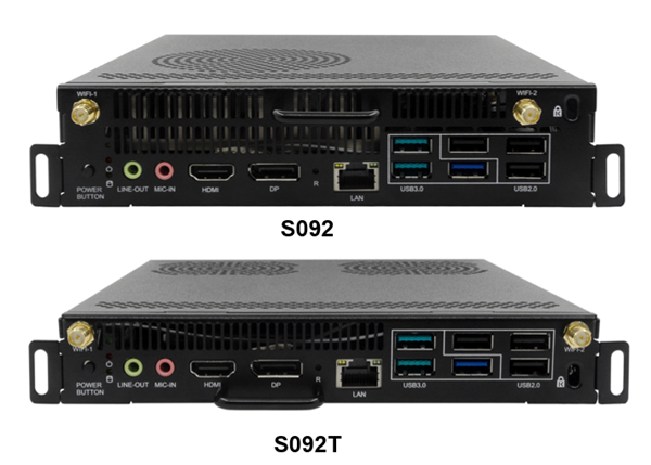 S092采用標(biāo)準(zhǔn)OPS-C設(shè)計(jì),同樣支持雙通道內(nèi)存,支持9路USB2.0/USB3.1/Type-C,支持M.2 WIFI/BT模塊,WIFI 6無線連接,滿足4K 高清HDMI+DP雙路顯示輸出;相比較S092,S092T采用30mm超薄設(shè)計(jì),適應(yīng)教學(xué),會(huì)議等行業(yè)大屏超薄顯示發(fā)展。