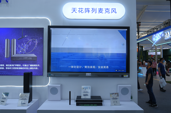 艾力特在本屆展會展示的新產品是教室音頻硬件終端和音頻軟件平臺,硬件終端應用在兩類教學場景:一類是專遞課堂場景使用的天花麥克風陣列,這是一款集多路麥克風陣列和3A音頻算法于一體的音頻終端,采用先進的降噪、回聲消除和波束形成算法,具有聲源追蹤、教室聲場自適應、設備集中管控的特點,用戶只需在教室安裝一臺麥克風陣列即可實現整個教室的清晰拾音和遠程互動;另一類是教室擴聲場景使用的廣播和擴聲一體化解決方案,這個方案最大的價值是一套音頻系統解決了傳統教室擴聲和廣播多系統、多設備部署且不兼容的痛點。