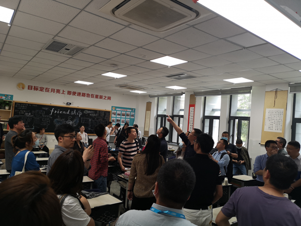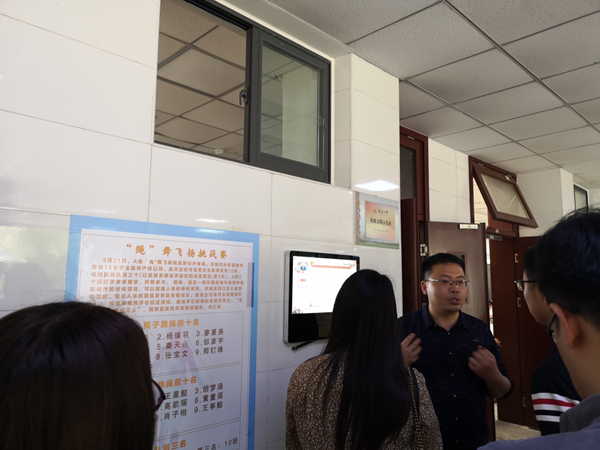 走進天府七中,由學校學教服務中心吳先彬主任帶隊,介紹校園風貌、文化和智慧教室的實際場景應用。