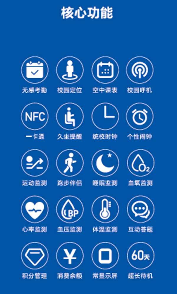 云教:感智手表能夠測(cè)量各項(xiàng)體征數(shù)據(jù),包括:運(yùn)動(dòng)步數(shù)、心率、血氧、體溫、睡眠等健康數(shù)據(jù)。內(nèi)置三個(gè)頻段支持一卡通、無感考勤、空中課表,更詳細(xì)參考下圖: