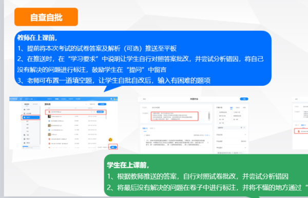課前:老師在上課前可提前將本次考試的試卷答案及解析推送至平板,在推送時(shí)可以在“學(xué)習(xí)要求”中說明讓學(xué)生自行對照答案批改,并嘗試分析錯(cuò)因。也可以布置一道填空題,讓學(xué)生在自批自改后,輸入有困難的答題項(xiàng),收集學(xué)生反饋。