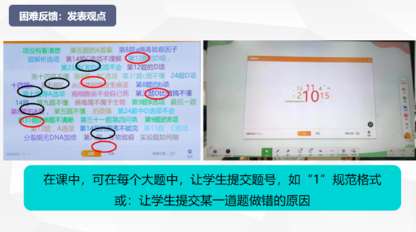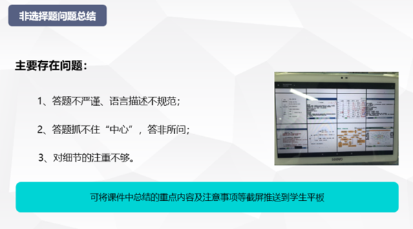 4困難反饋在課中,可通過發(fā)表觀點(diǎn)功能讓學(xué)生提交還不明白或者是有困難的題目,規(guī)范學(xué)生提交格式,讓學(xué)生提交題號上來;或通過發(fā)表觀點(diǎn)讓學(xué)生提交某一道題做錯(cuò)的原因,對收集上來有困難的選擇題進(jìn)行針對性的講。同時(shí),可將講評試卷課件中總結(jié)的重點(diǎn)內(nèi)容及注意事項(xiàng)截屏推送給學(xué)生平板,引導(dǎo)學(xué)生保存筆記,便于課后復(fù)習(xí)。