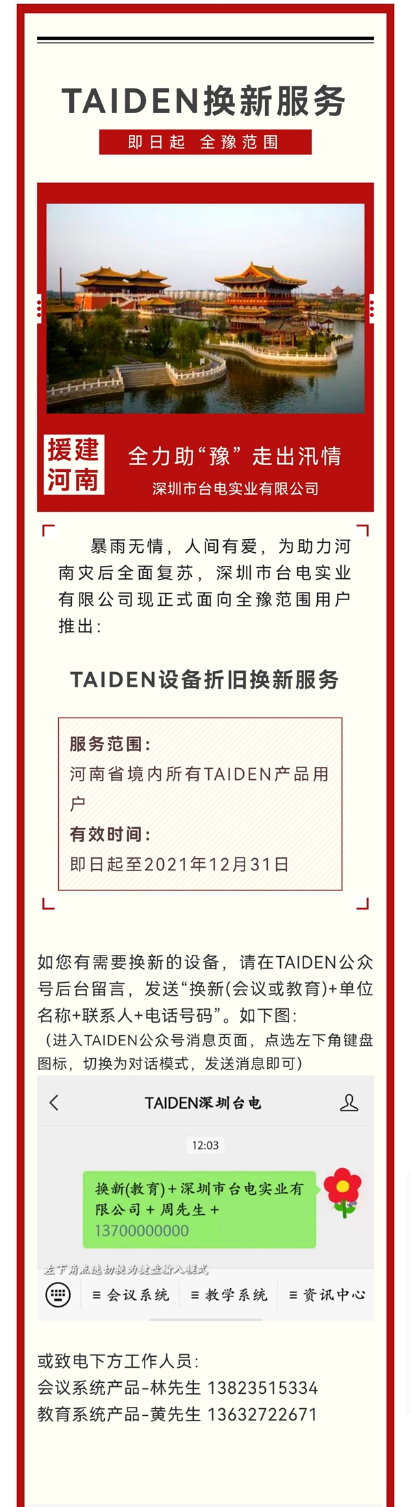 支援河南——TAIDEN換新服務全面啟動!