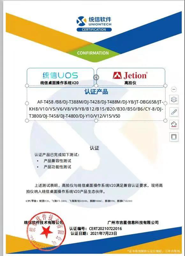 日前,由吉星自主研發(fā)的高拍儀與統(tǒng)信UOS桌面操作系統(tǒng)V20完成產(chǎn)品兼容性測試以及產(chǎn)品功能性測試。