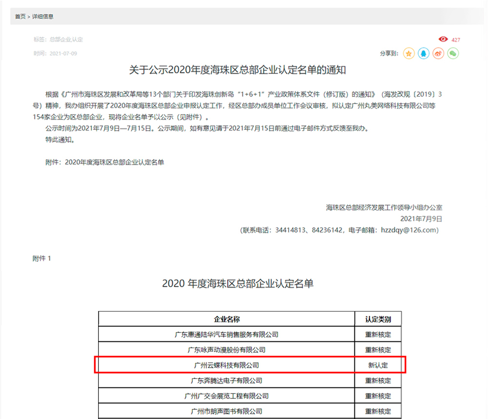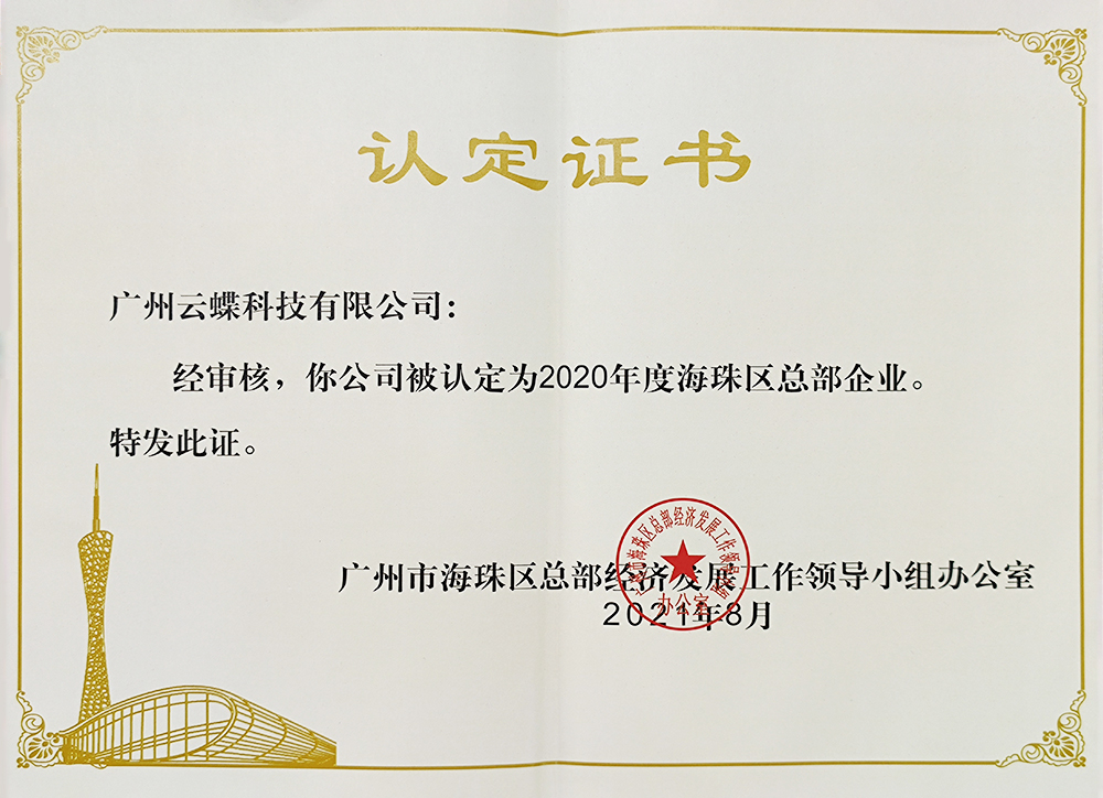 近日,云蝶科技被廣州市海珠區總部經濟發展工作領導小組辦公室認定為“2020年度海珠區總部企業”。