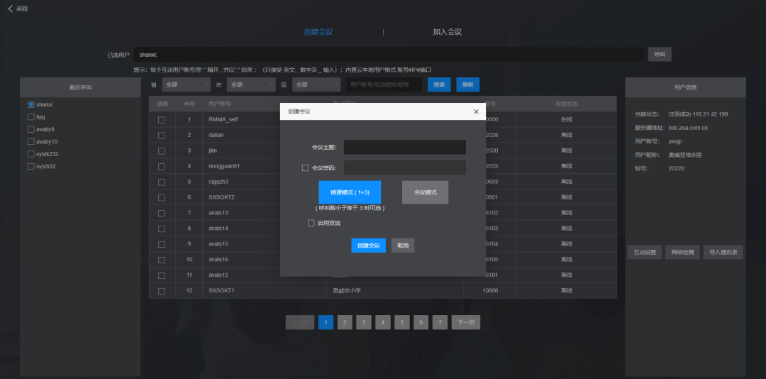 2.選擇互動課室(自己用戶名無需勾選),按“呼叫”按鈕;