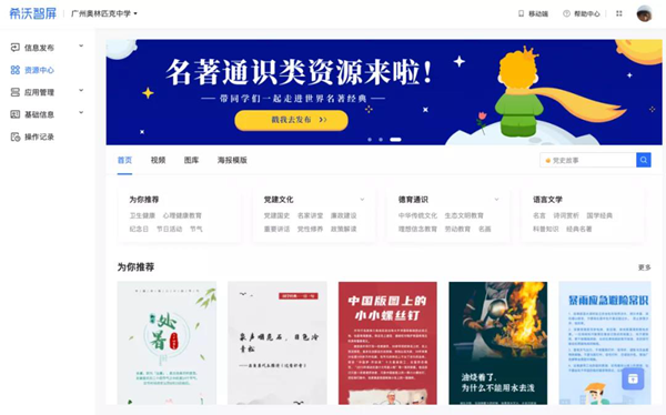 希沃云屏上線通識課程資源,既拓寬了校園文化的展示內(nèi)容,也有助于學(xué)校做好通識教育傳播,加強學(xué)生德育教育。其充分借助信息技術(shù)的優(yōu)勢,以創(chuàng)新、高效、便捷的發(fā)布方式,提高校園文化建設(shè)效率,老師無須再費時費力上網(wǎng)搜索素材,有效節(jié)省人力物力。