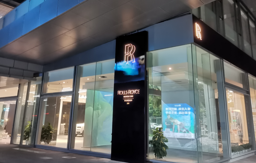 勞斯萊斯汽車深圳展廳位于福田中心區,展廳整體利用燈光與兩面開放的落地玻璃,給往來行人打造出一種通透、開闊、明亮的展示視覺效果。