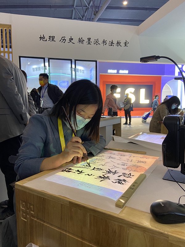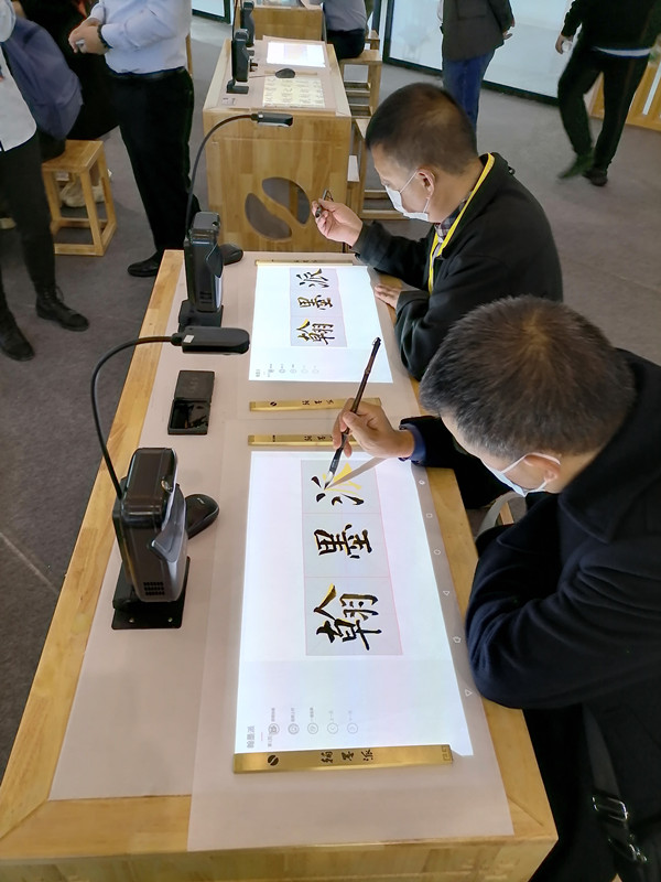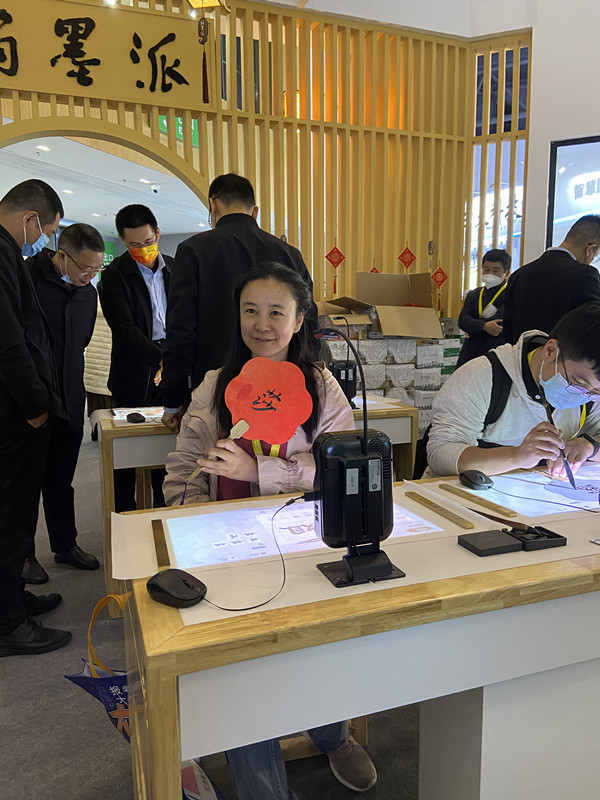 此次展會推出創意禮品,各位參觀者可以到翰墨派云書法教室任意體驗臨摹,之后將臨摹佳作帶走。創意禮品有各色團扇、福字卡、翰墨宣紙等。展會第一天參與者眾多,每位路過的賓客都不忍錯過妙筆生花的機會。
