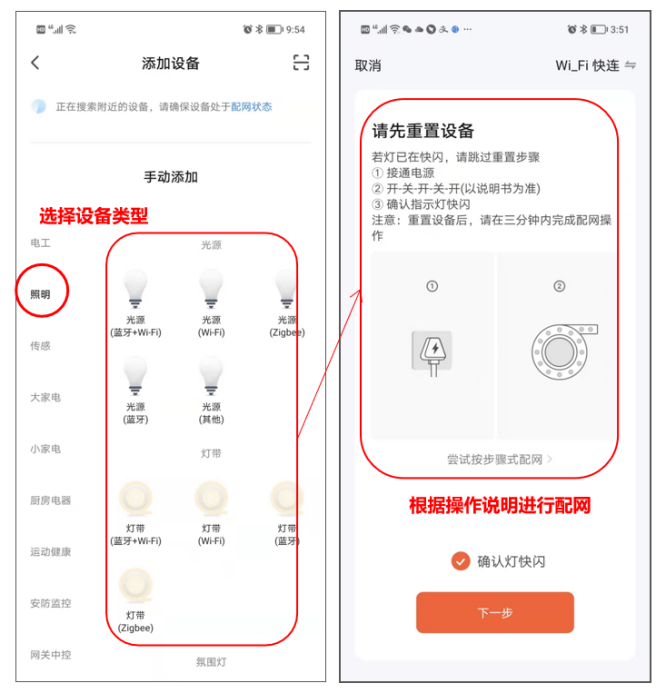 手動添加:如無法自動添加,則可選擇“照明”→對應燈具類型,在確定燈具類型后即可跟隨軟件界面提示的操作步驟進行配網。